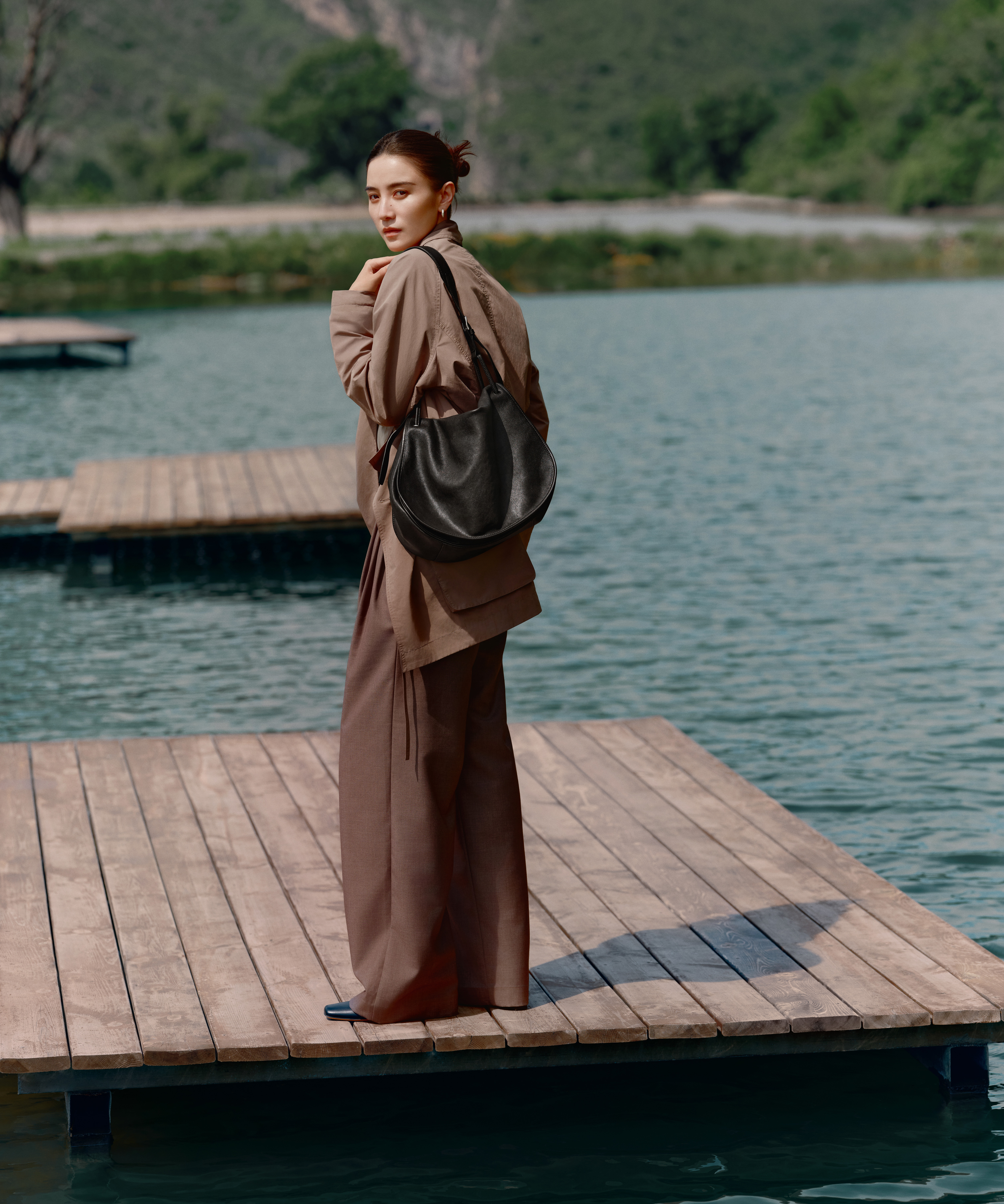 品牌最新短片中,宋佳身背裘真信使系列,穿梭于村庄、湖泊、田野之间——树木的年轮刻着岁月,雨水浸润皮面的痕迹也印着时光。那句「不谈主义,好好经历」的文案,并非空泛表达,而是精准呼应了植鞣皮的特性与品牌理念。