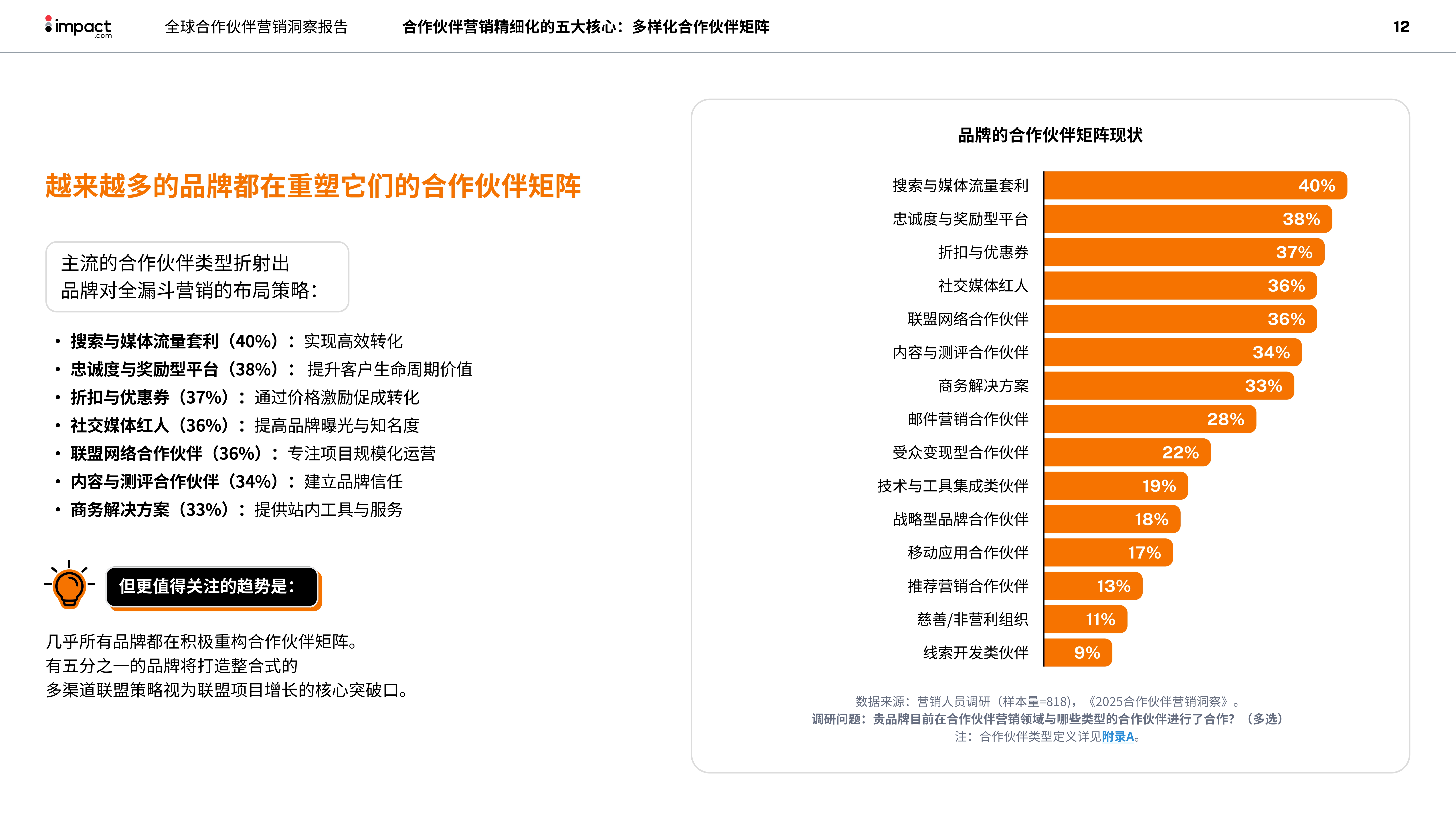 提到合作伙伴,我们最常想到的可能是传统但能有力促进转化的折扣与优惠券,也可能是近几年备受重视的社交媒体红人,但这并非整个合作伙伴生态的全貌。从发现品牌、兴趣培养、到转化与长期留存,整个消费者旅程的每一个关键节点,都有对应的合作伙伴提供帮助。而「报告」指出,提升合作伙伴的多样性、完整性,被不少品牌视为联盟项目增长的核心突破口。