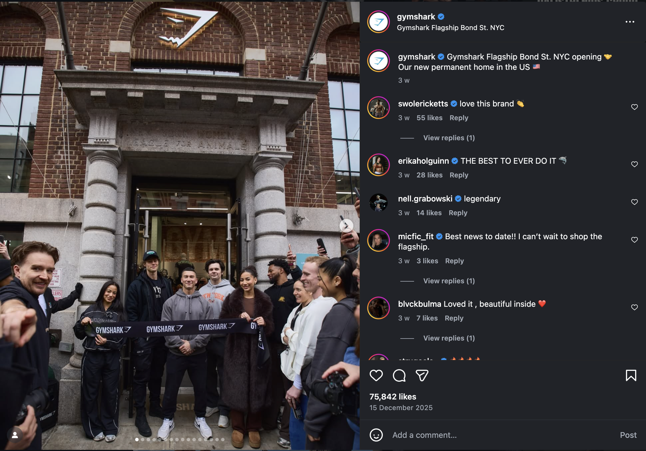 成立至今,Gymshark 有大量的合作模式与互动活动来维护自己的创作者社区,比如为 Gymshark Athlete 的合作内容支付报酬,为其粉丝提供专属折扣码,举办线下训练营,邀请他们参与门店开业等品牌活动。品牌官方 Instagram 账号中的大部分图片,视频内容中也都有 Gymshark Athlete 的出镜。