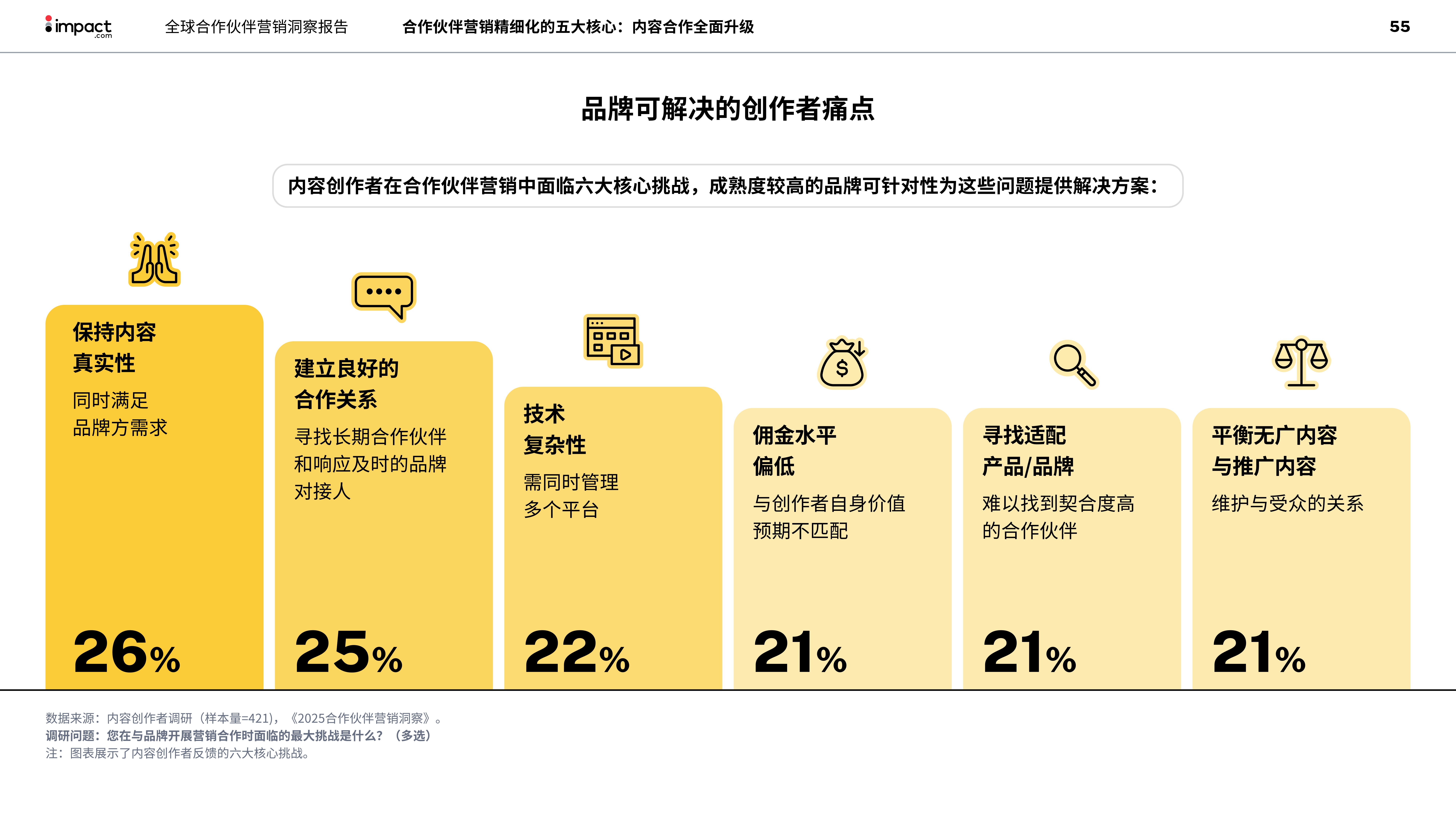 健康的合作伙伴营销应该是共赢的、持续的,而非一场场零和博弈。这要求品牌方在考虑自身需求外,也要更好地理解合作伙伴的需求。报告对于内容创作者的职业化发展趋势进行了调研,列出了内容创作者在合作伙伴营销中面临的核心挑战。