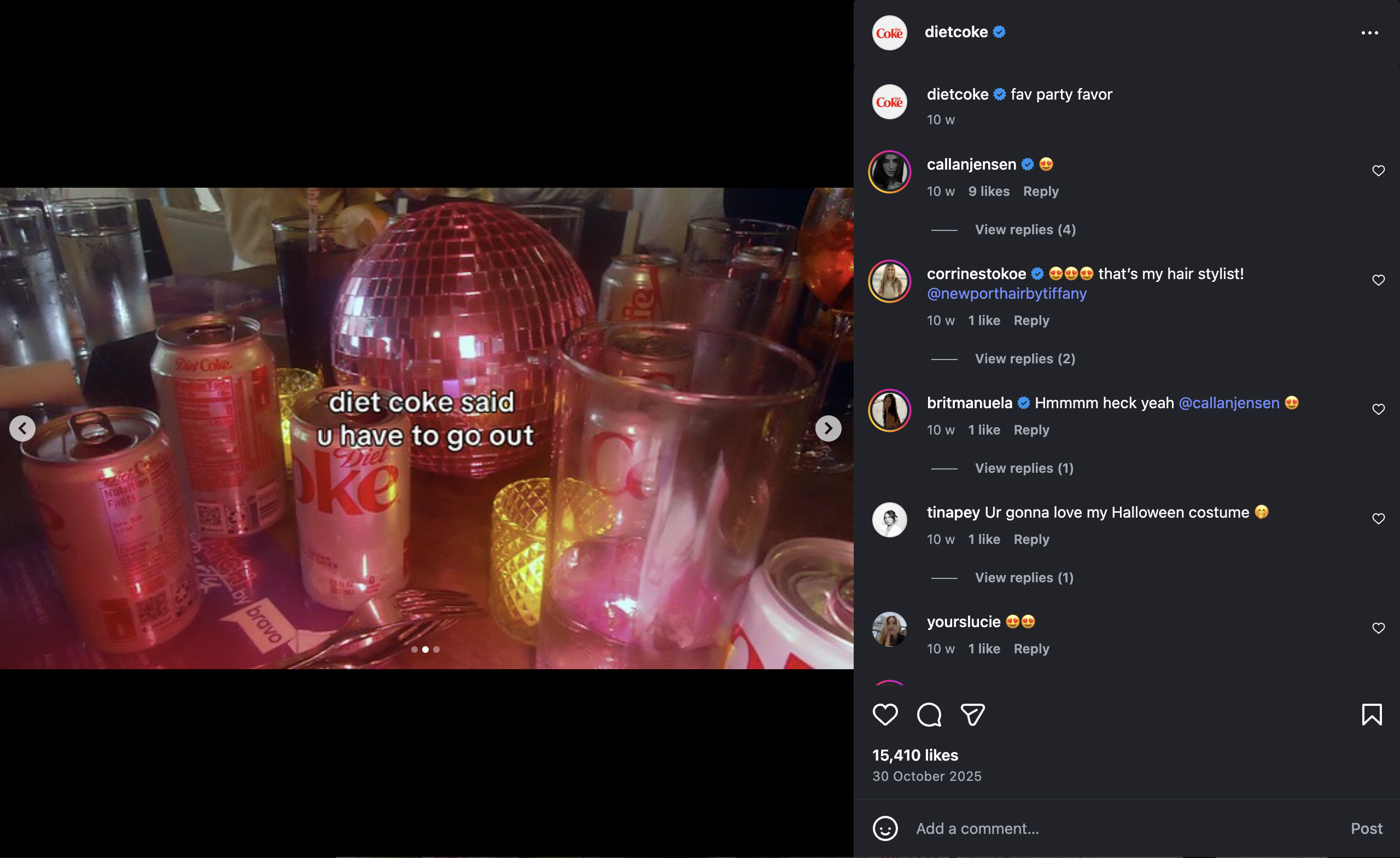 Diet Coke 通过「记录生活」的图片与视频,不断向受众展示,Diet Coke 能以什么样的形式出现在人们的日常生活中——它可以成为你的午餐搭子、街拍道具、聚会上的氛围担当,可以提升你的时尚完成度。甚至 Diet Coke 自己都会自我定位为「the best accessory(最好的配饰)」。