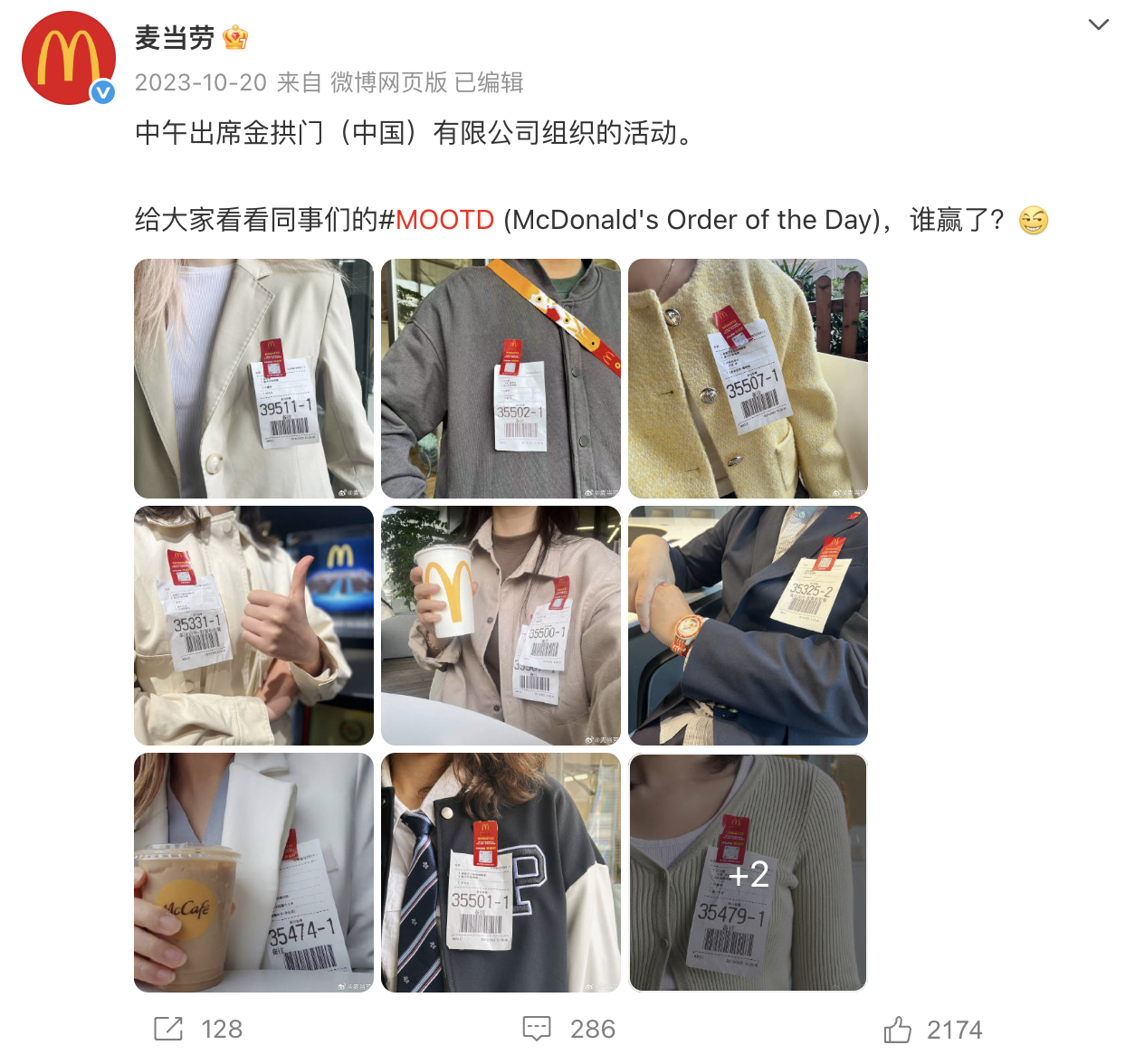 此前网友常将麦当劳小票贴在胸前,配文「出席金拱门(中国)有限公司组织的活动」,在社交媒体形成「麦门信徒」的身份标榜。