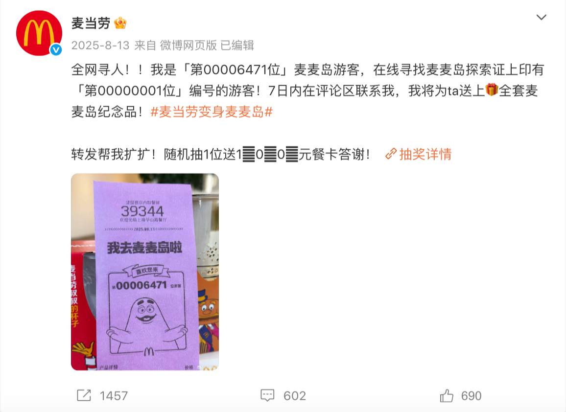 借助小票的专属编号设计,品牌不仅不定期在网上「全网寻人」,寻找特定编号的「麦麦岛游客」并送上纪念品;还借助不同颜色和人物的小票设计,来满足粉丝的收藏欲。