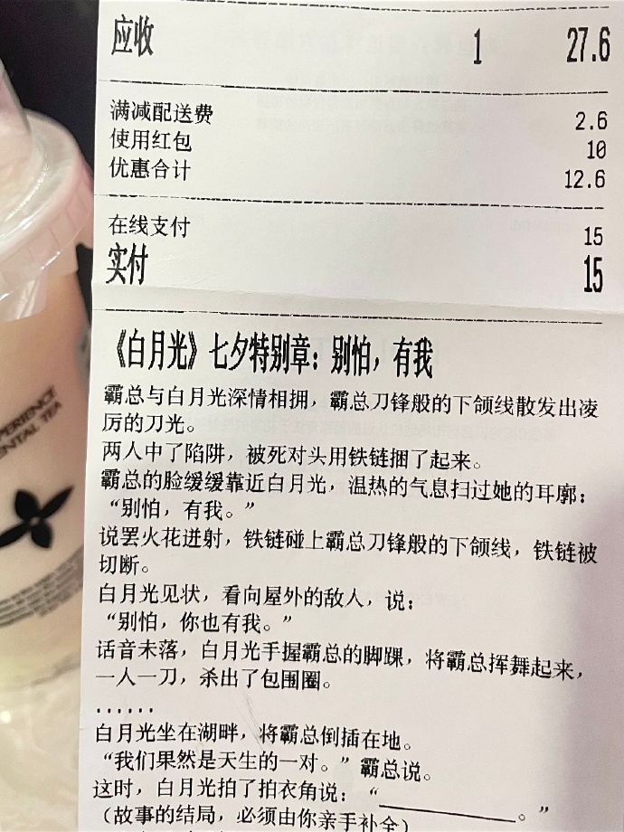 七夕预热期,茉莉奶白围绕「爱情灵药」主题,在小票上连载霸总文学《白月光》,网友为追更主动复购,形成自发传播;