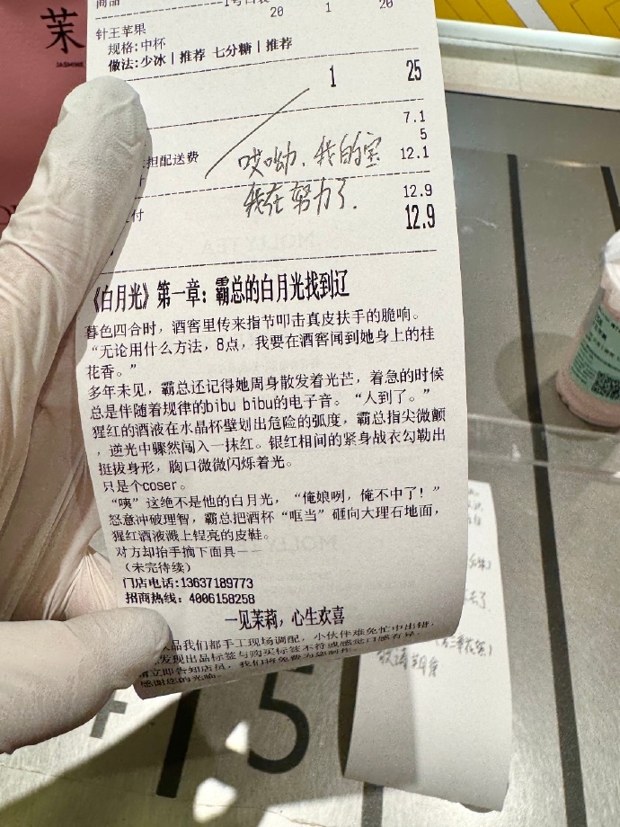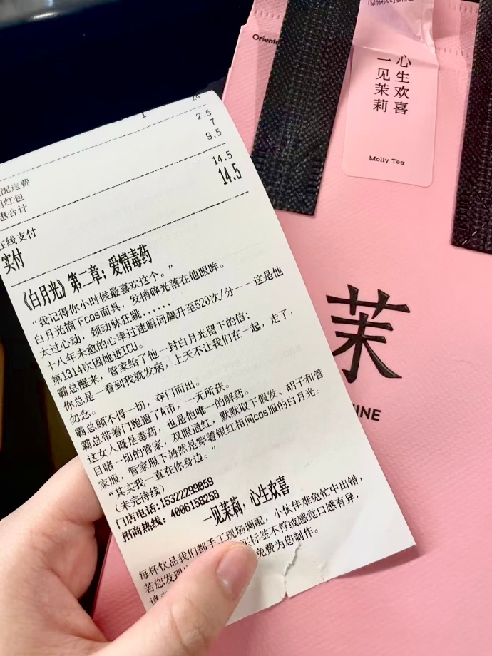 2025 年「霸总文学」风靡社交网络时,茉莉奶白就在小票上连载《白月光》霸总小说,引发用户的分享与追更;
