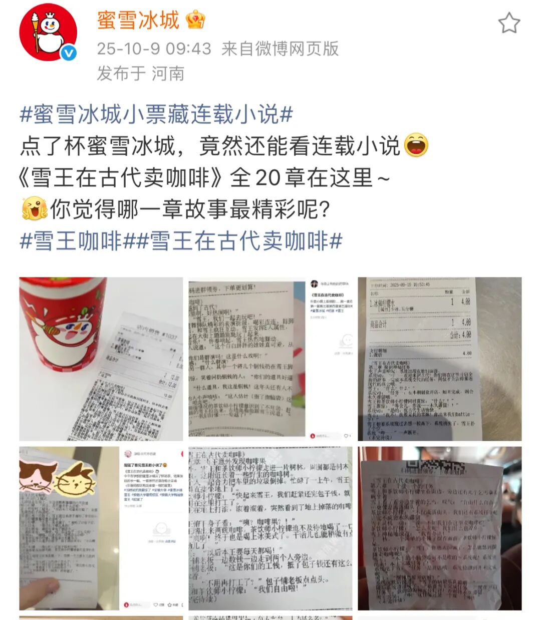 相较于茉莉奶白的短连载,蜜雪冰城 20 个章节的长连载式小票文学,更像是一次完整 IP 内容的呈现。