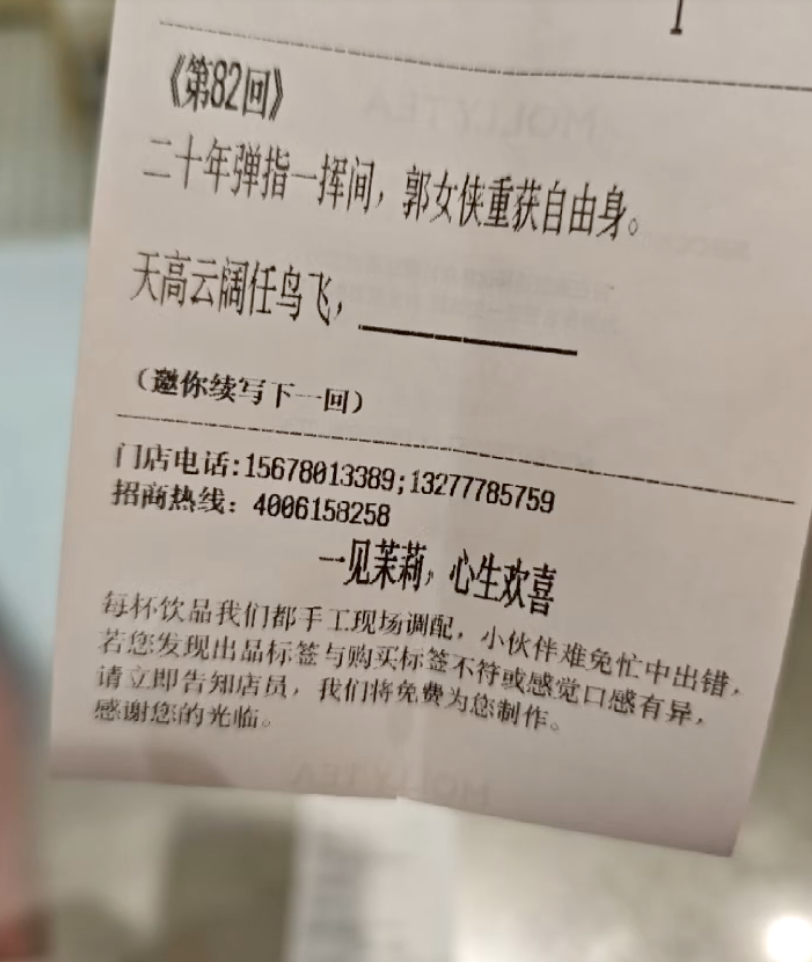 就在这波集体怀旧情绪蔓延之际,茉莉奶白的小票接住了热度——印上《第 82 回》专属文案,邀请网友续写故事结局: