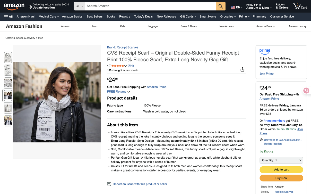 CVS 却反倒「俏皮」地接受了这个梗,甚至还推出「小票围巾」周边,在亚马逊等公开渠道上售卖,将网友的调侃转化为品牌特色,让「超长小票」从争议点变成强记忆的视觉符号。