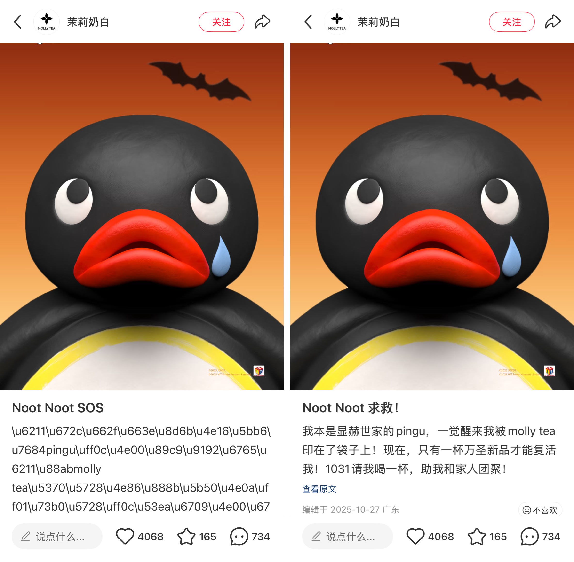 万圣节与 Pingu 合作期间,茉莉奶白更采用「乱码」设计呼应「Pingu 求救」剧情,让消费者自助解密。