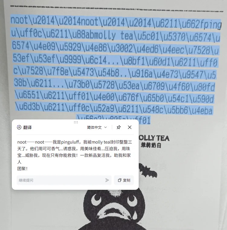 品牌小票上也印有 Pingu 的「乱码」求助