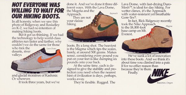 1981 年,Nike 正式听取登山者的意见并接受了「轻量化」的户外概念,Nike Hiking 系列由此问世。