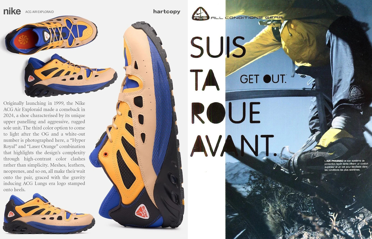 这一时期的 ACG 视觉极具辨识度:复古蓝绿、荧光黄、洋红等高饱和色彩,打破传统户外的沉闷单调。经典鞋款 AIR MOWABB 也在这一阶段诞生,成为后续多年 ACG 设计的重要原型。