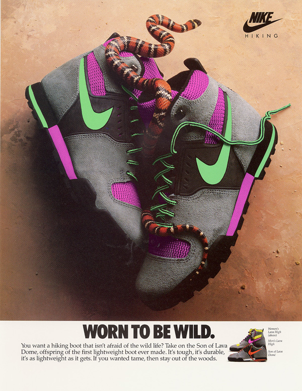 上世纪 80 年代 Nike Hiking 系列宣传海报,产品以明亮鲜艳的色彩运用脱颖而出。