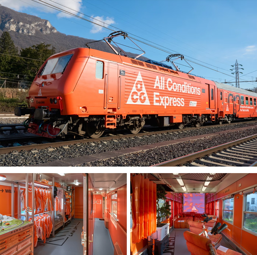 2025 年 8 月先是携 Ultrafy 首次亮相德国慕尼黑 UTMB ;2026 年 2 月,伴随米兰冬运会开幕,品牌将由 Milan 启程开往 Orobic Alps 的意大利列车改造成机能户外移动基地营 All Conditions Express ,通体铺满橙色,内则被改造成不同的空间。