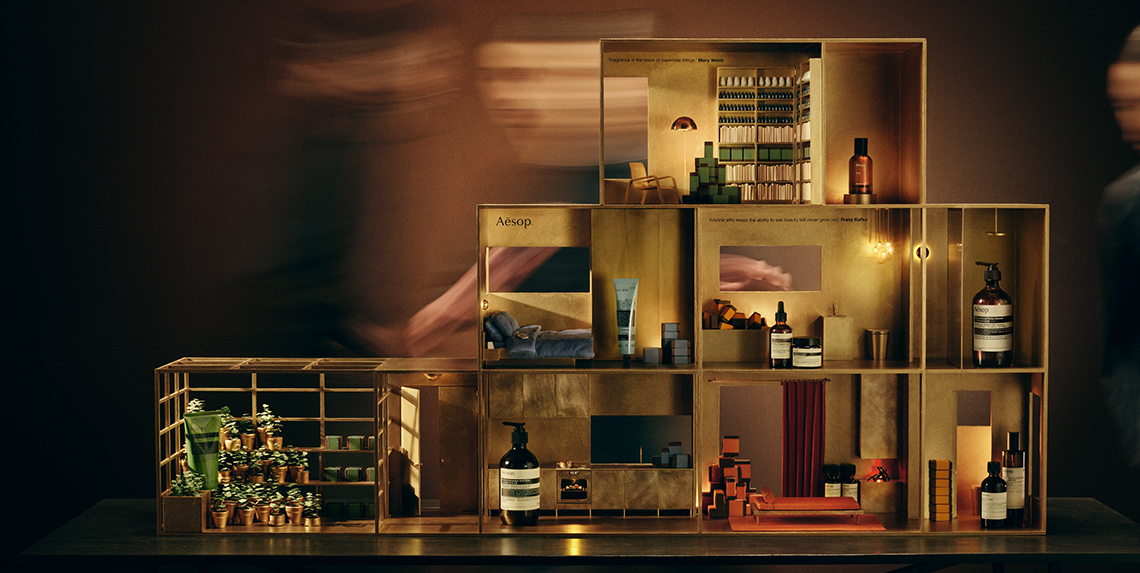 短片中的袖珍世界,也在 Aesop 伊索的店铺橱窗中被重新演绎:巨大的双手与产品,向往来行人递上温暖邀约;各式具有地方特色的椅子也被镀上黄铜色泽,为店铺增添节日氛围。