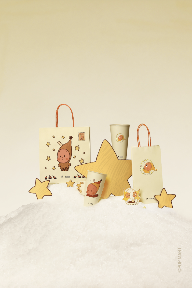 伴随产品上新,喜茶同时推出基于全新星星人形象设计的,包括饮品杯、纸袋、杯套在内的全线联名限定包材,以及灵感小卡、贴纸、徽章、茶碗等限定周边,满足 IP 粉丝的各式收藏需求。联名杯套上还藏有设计小彩蛋,转动杯套时,可以为杯子上的星星人戴上围巾,温暖就从手中的喜茶传递开来。