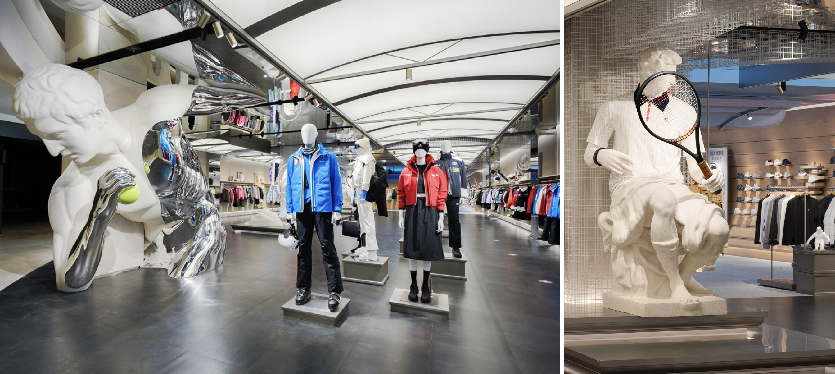 外立面以罗马斗兽场建筑为灵感, 沉积岩材质的经典拱门结构象征罗马文明的深厚底蕴,也叙说着品牌的意大利基因。门口伫立的巨型雕塑以《掷铁饼者》对竞技瞬间的经典定格为灵感,与店内取意自《朱利亚诺·德·美第奇像》、身披 FILA 经典网球单品 BB1 大满贯 POLO 的另一座雕塑遥相呼应 —— 一个手掷网球,一个手持球拍,共同演绎《网球新章》主题。品牌基因中源自古罗马竞技文化的力量感与秩序美,在当代运动语境中得以延续。