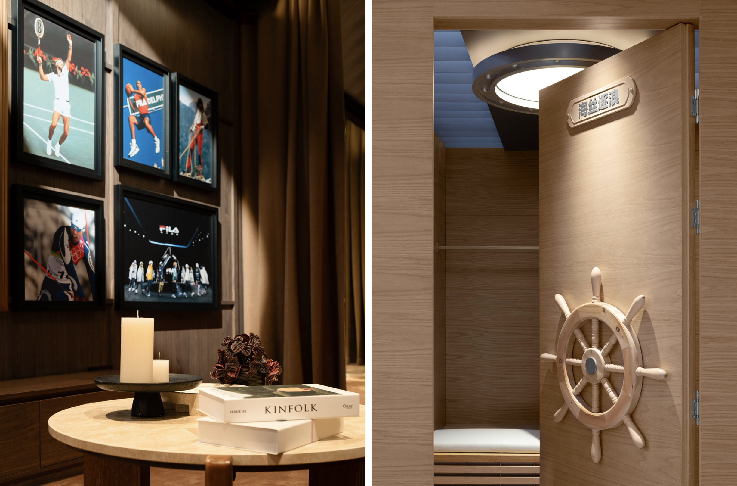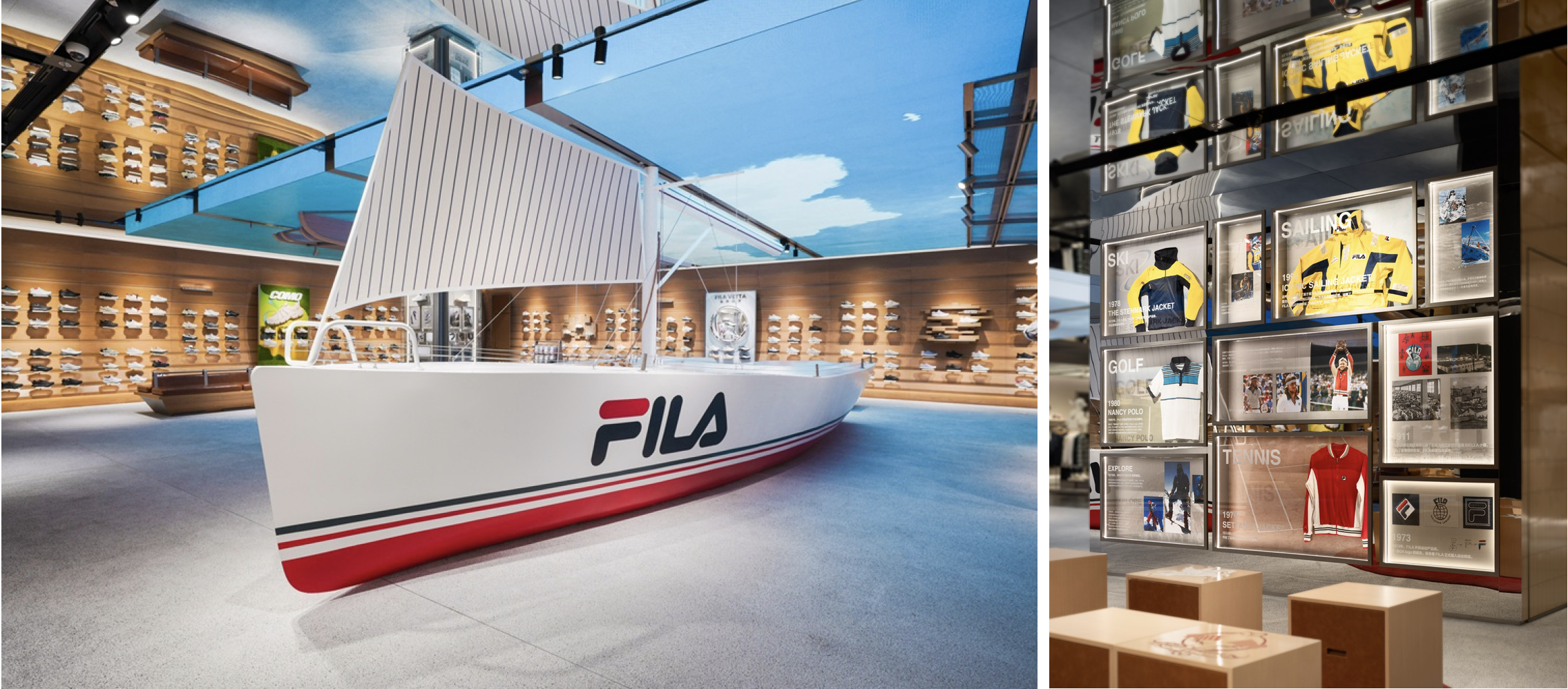 在这里,环球独航的宏大叙事与海上丝绸之路的历史及 FILA 百年探索的品牌精神融为一体。区域中心特别陈列了一艘复刻「FILA TRI 号」的帆船装置 —— 1999 年,FILA 赞助意大利帆船家吉奥瓦尼·索尔迪尼(Giovanni Soldini)驾驶该帆船原型,独自航行大西洋 116 天,创下了新的世界纪录。「荣耀回廊」则集中展示了品牌在航海、滑雪、登山、网球、高尔夫等领域的「冠军时刻」,以及陪伴冠军的传奇单品。从网球名将比约·博格(Björn Borg)捧杯时的胜利夹克,到「果岭皇后」南茜·洛佩兹(Nancy Lopez) 标志性的 NANCY POLO 等 —— 每一个历史瞬间,都代表着 FILA 通过技术、审美的持续创新,以破浪之姿引领运动与时尚的航程。