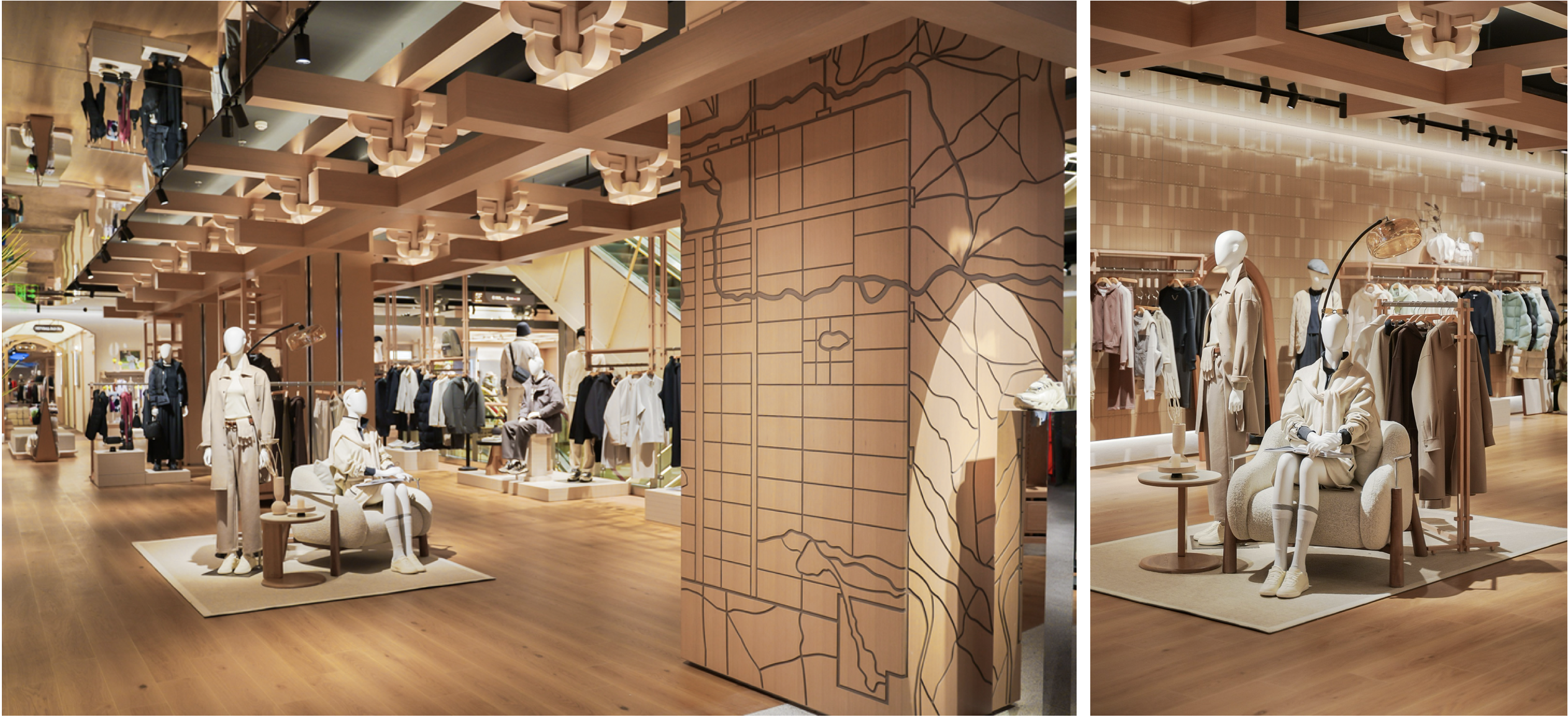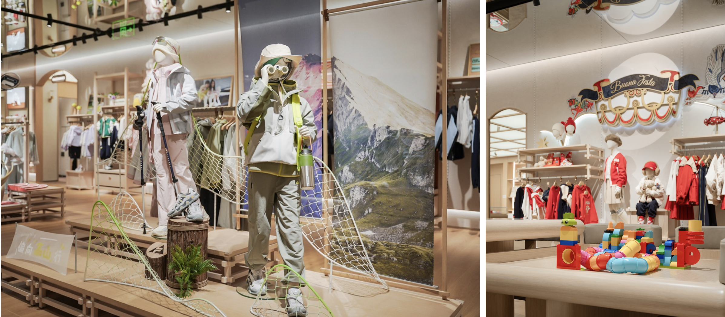 与设计语言相呼应,左侧生活区将 FILA 生活系列服装与精致的家居氛围摆件进行情境化搭配,让消费者能够在「生活客厅」场景中,从容选购日常生活与社交通勤所需。右侧潮流区则通过一系列模特矩阵,为追逐先锋趋势的年轻人带来引领潮流、彰显鲜明文化态度的穿搭组合。