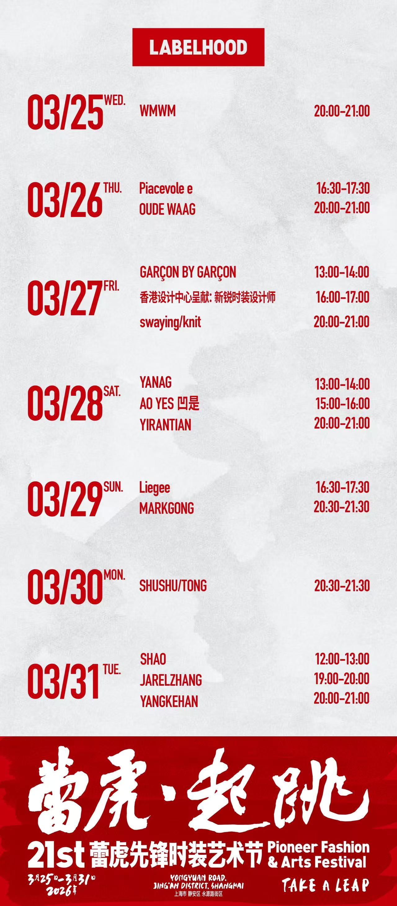 2026 年 3 月 25 日至 3 月 31 日上海时装周,第 21 季蕾虎先锋时装艺术节将在上海市静安区永源路街区举行。本季以「蕾虎 · 起跳(Take a Leap)」为主题,在走过二十季之后,蕾虎迎来新的周期,也迈向下一个十年的起点。